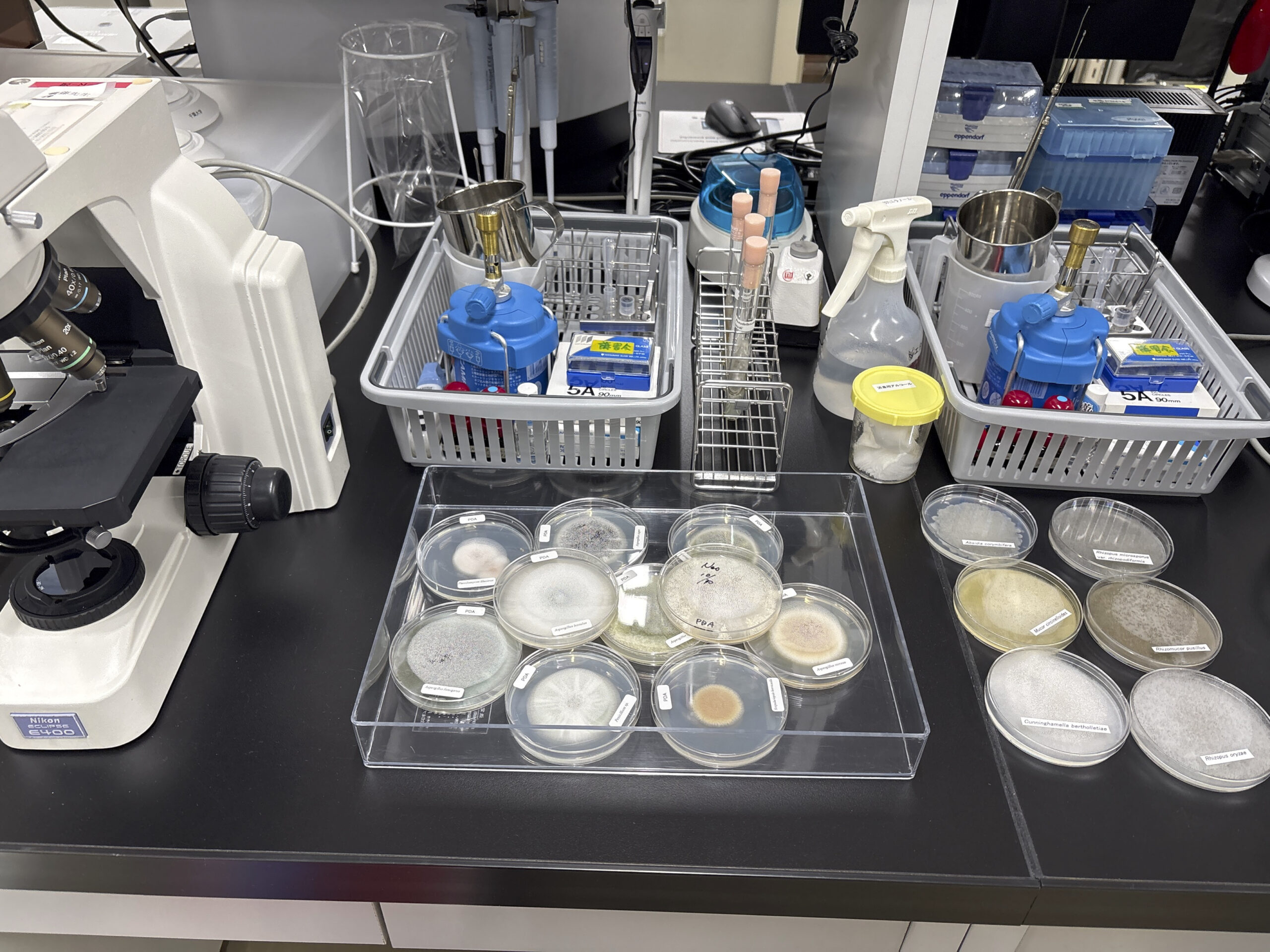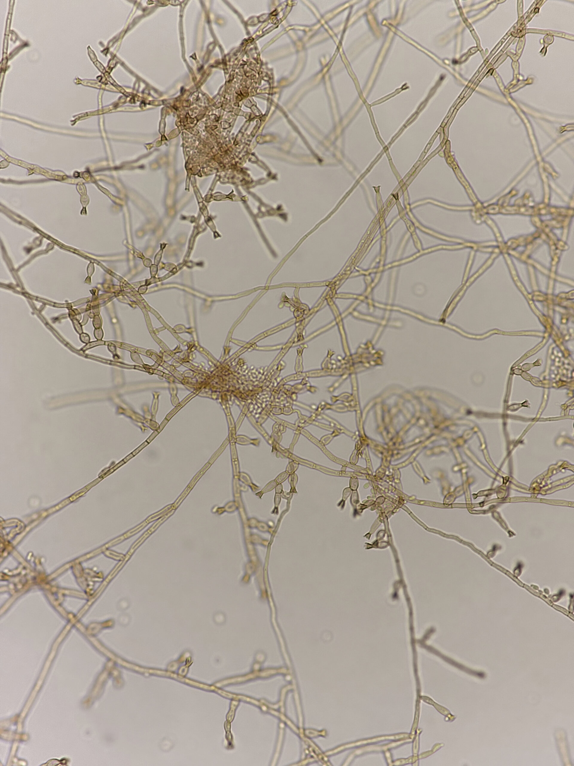 午後の実習は大変充実し、初めて観察する真菌を含め、鏡検標本を自ら作成しながら形態学的特徴を観察するのは非常に学びが深いものになりました。iPhoneを使った顕微鏡接写技術が思いがけず上達し、写真フォルダ内には真菌図鑑コレクションを作れたのは貴重な財産です。また実習最後には、細菌検査室での教育・訓練用として活用できるよう27株の病原真菌セットを分与いただきました。当院の細菌検査技師および医学生教育において、真菌同定技術の底上げに大いに活用したいと考えています。
