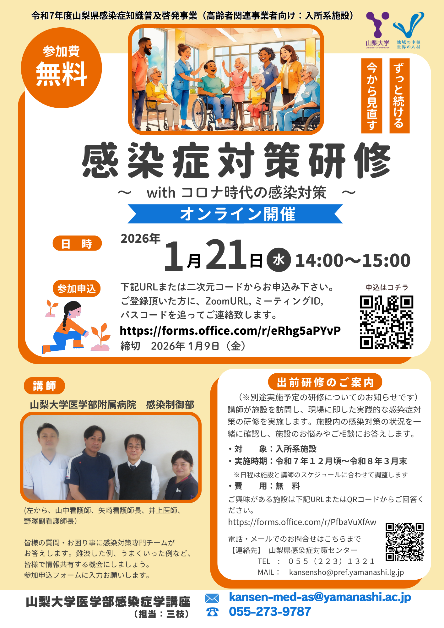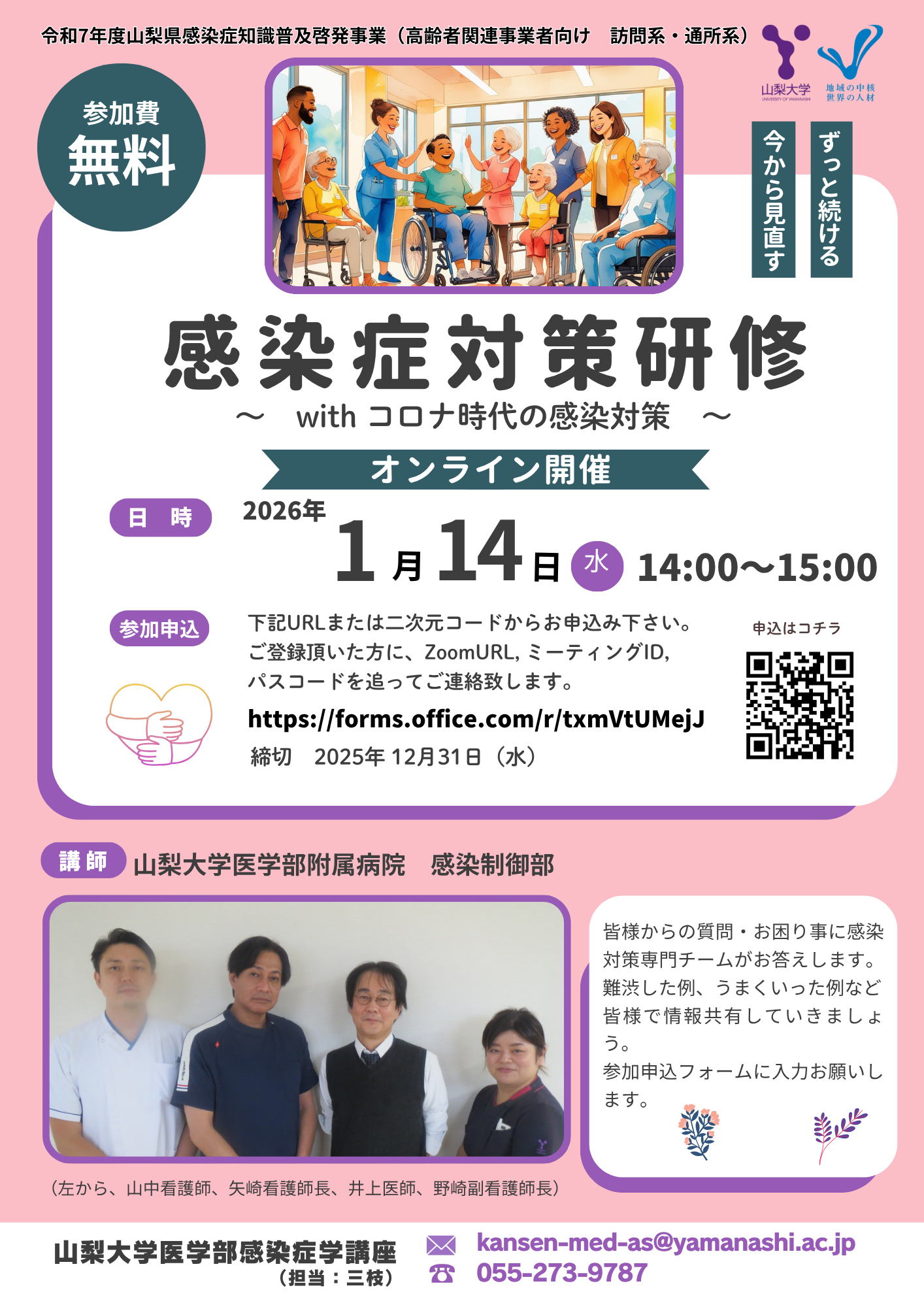 山梨県からの委託事業「感染症知識普及啓発事業」として令和4年度より開催しており、特に人と接する業種等における感染管理に関する知見向上のための研修となります。令和7年度からは、集団感染を防ぐため感染対策を強化すべき業種に絞って開催しています。